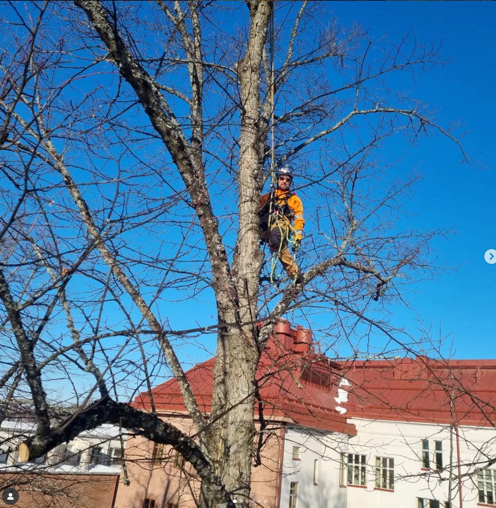 Kuvassa näkyy puunhoitoa kiipeilytekniikan avuin.