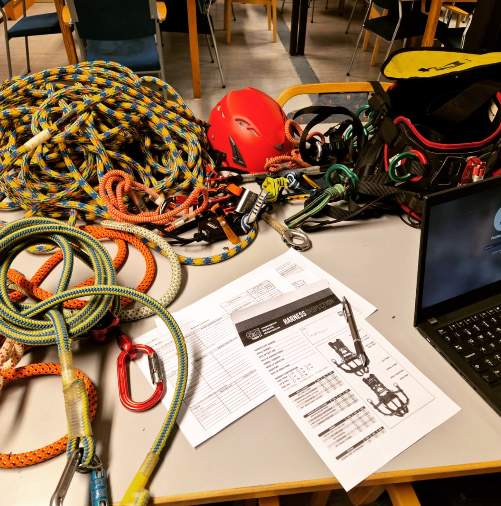Kuvassa näkyy puunkaadon kiipeilyvälineistön tarkastus.